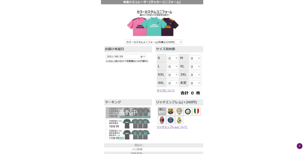 CLATTY様 価格シミュレーターシャツの枚数やデザインタイプ、お届け希望日などによって価格が変動するシミュレーターを実装しました。